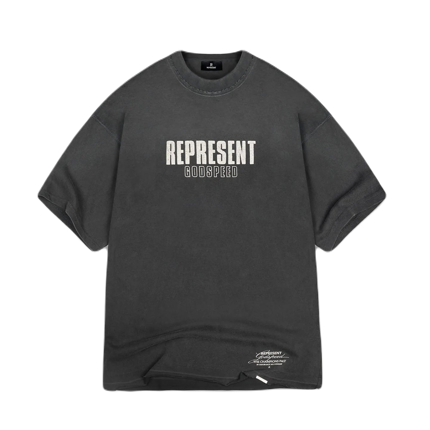 This Represent Godspeed T-Shirt combines luxury and edge with its slightly oversized fit, fade out wash, and raw edge hem. The distressed collar adds to the worn look, while the cracked print graphics on the front and back showcase the iconic Godspeed design.