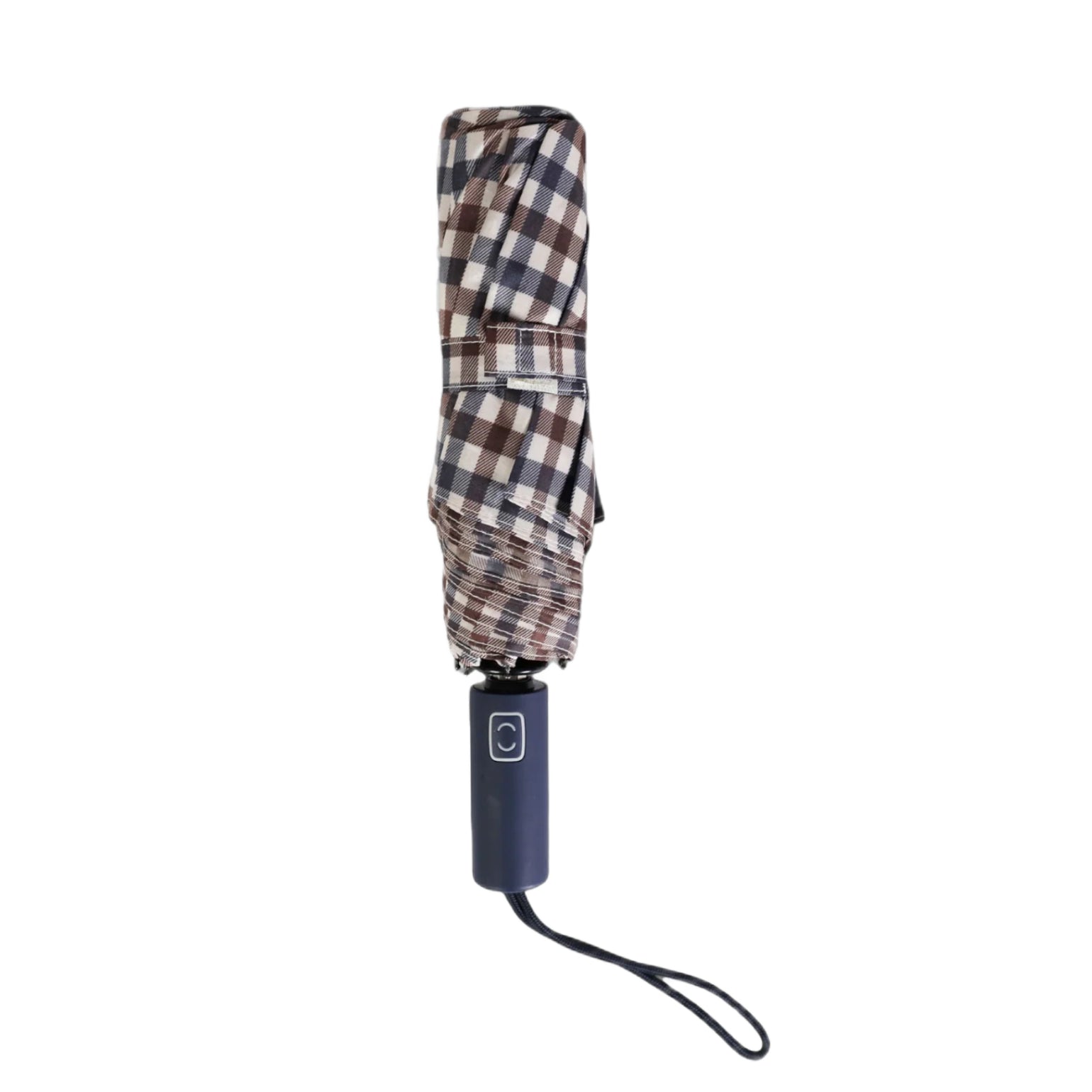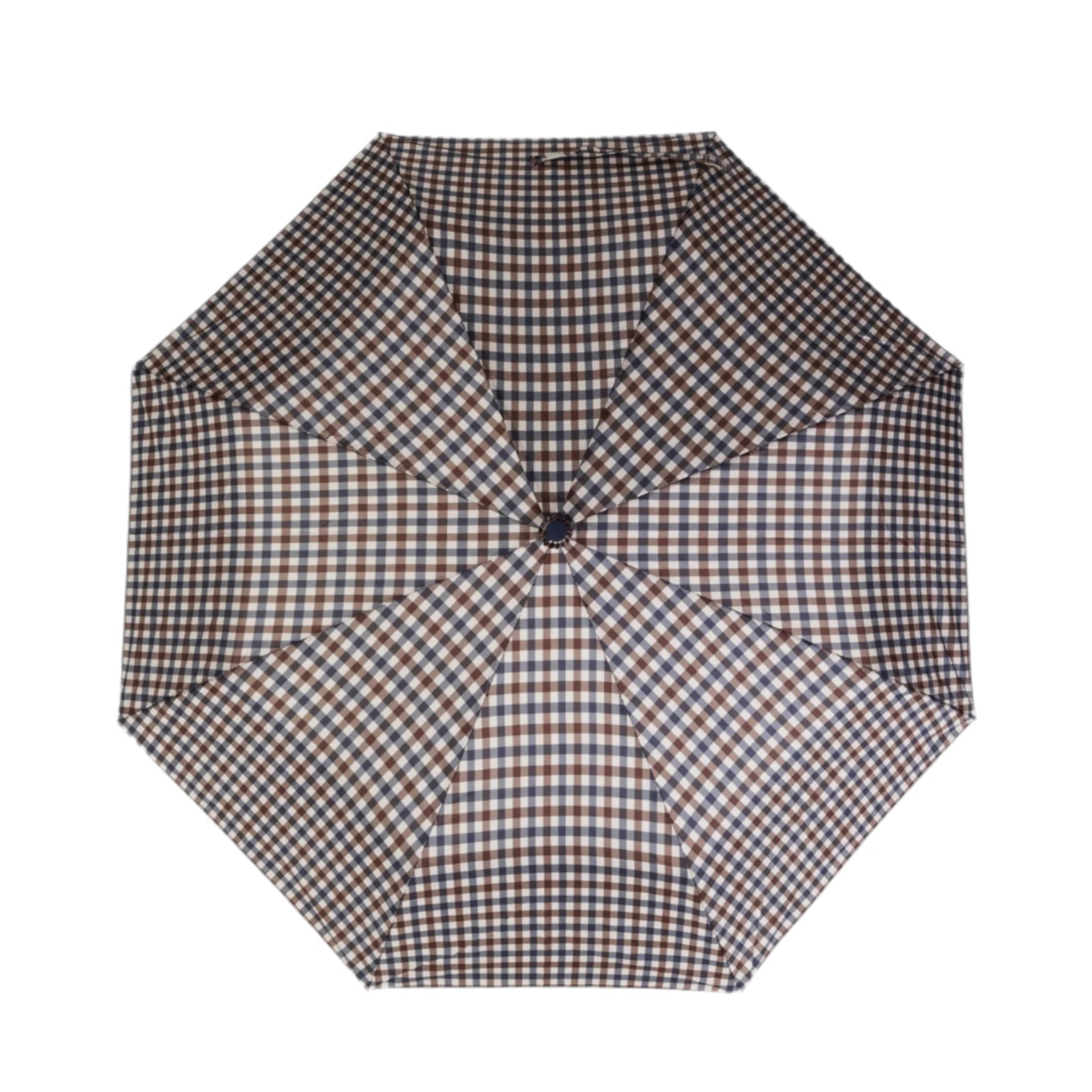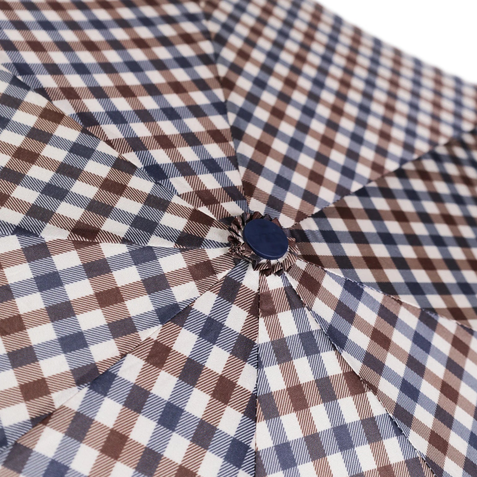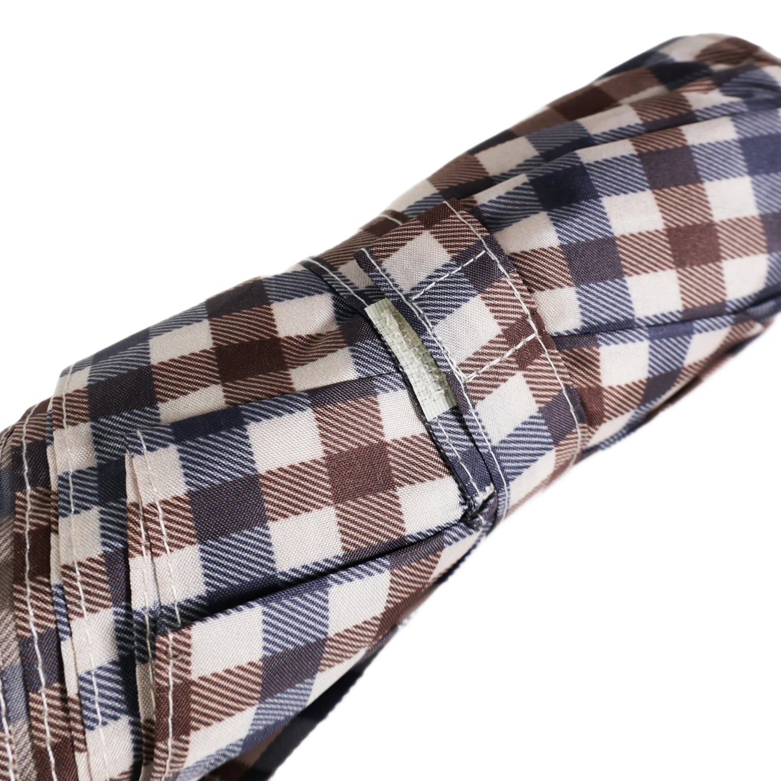 The Aquascutum Iconic Pocket Umbrella showcases the distinguished Club Check fabric pattern, crafted from durable 100% polyester. Its sophisticated design combines an aluminum frame with resilient resin fiber components and plastic rubber grips, ensuring optimal performance while maintaining the brand's signature elegance. Compact yet sturdy, this umbrella delivers premium weather protection with unmistakable British heritage styling.